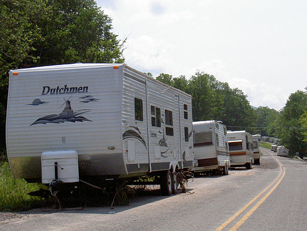 Every campsite along the river looks like this, with campers pulled up to the roads to avoid more flood damage.