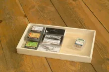 My first experiment was to get out the blocks I had, and just move them around on the board, visualizing the finished board with holes, trays and pegs. I didn't get to a final result in the first phase, but found the wooden bits I could use.